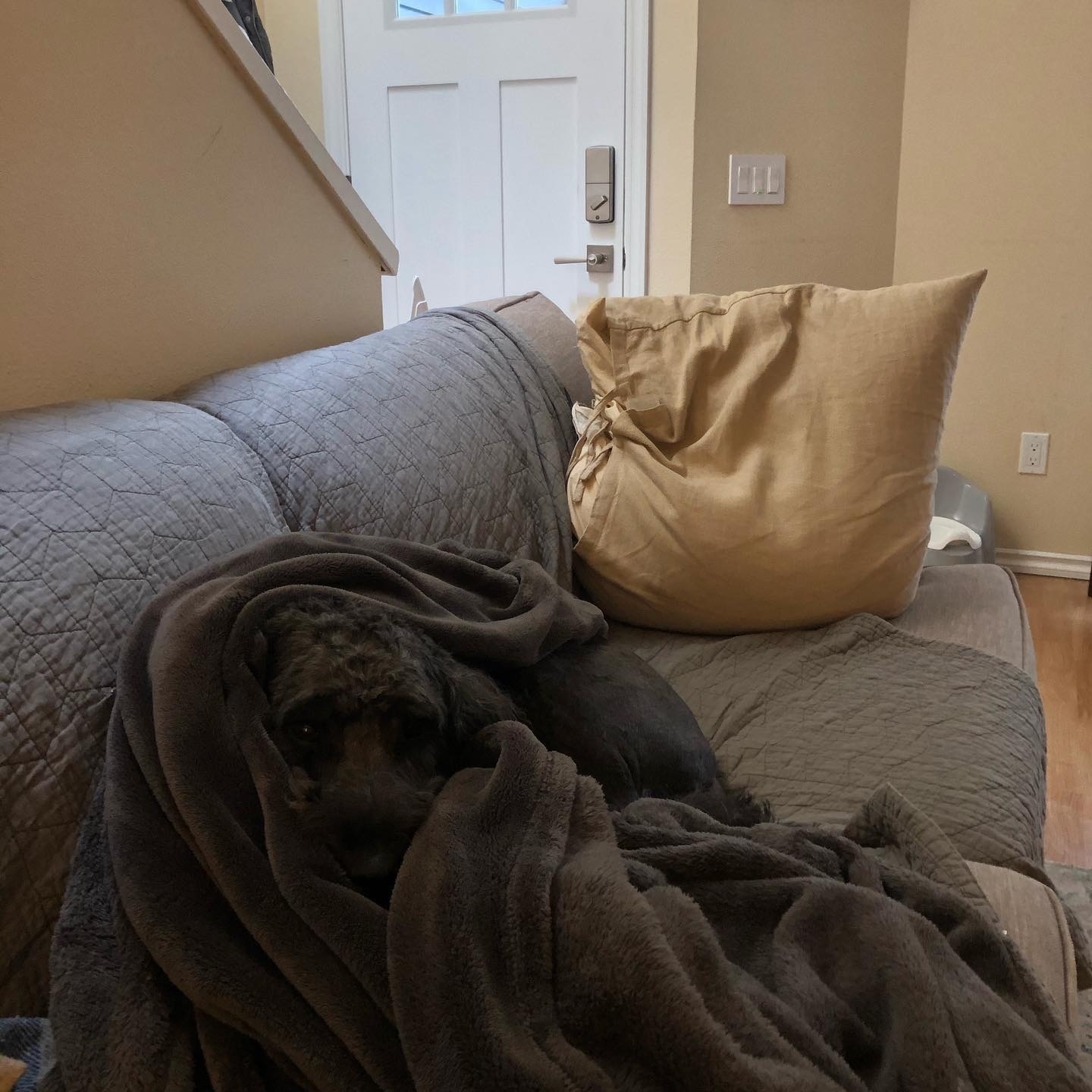 Zoey had to get a pretty tight shave due to some mats. But now she blends in with our lazy couch blanket and I definitely sat on her this morning. Felt so bad.