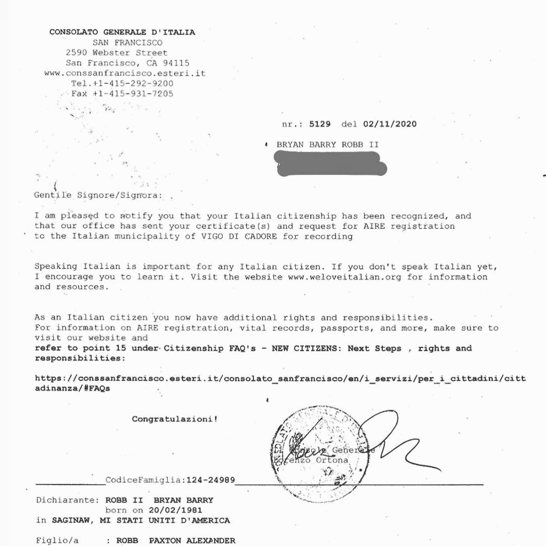 The culmination of many years of work finally paid off today with our recognition as Italian citizens. It still hasn’t fully set in, but I’m overjoyed, especially to be able to pass this onto my kids. Fingers crossed for some other good news today as well! 🇮🇹🇺🇸