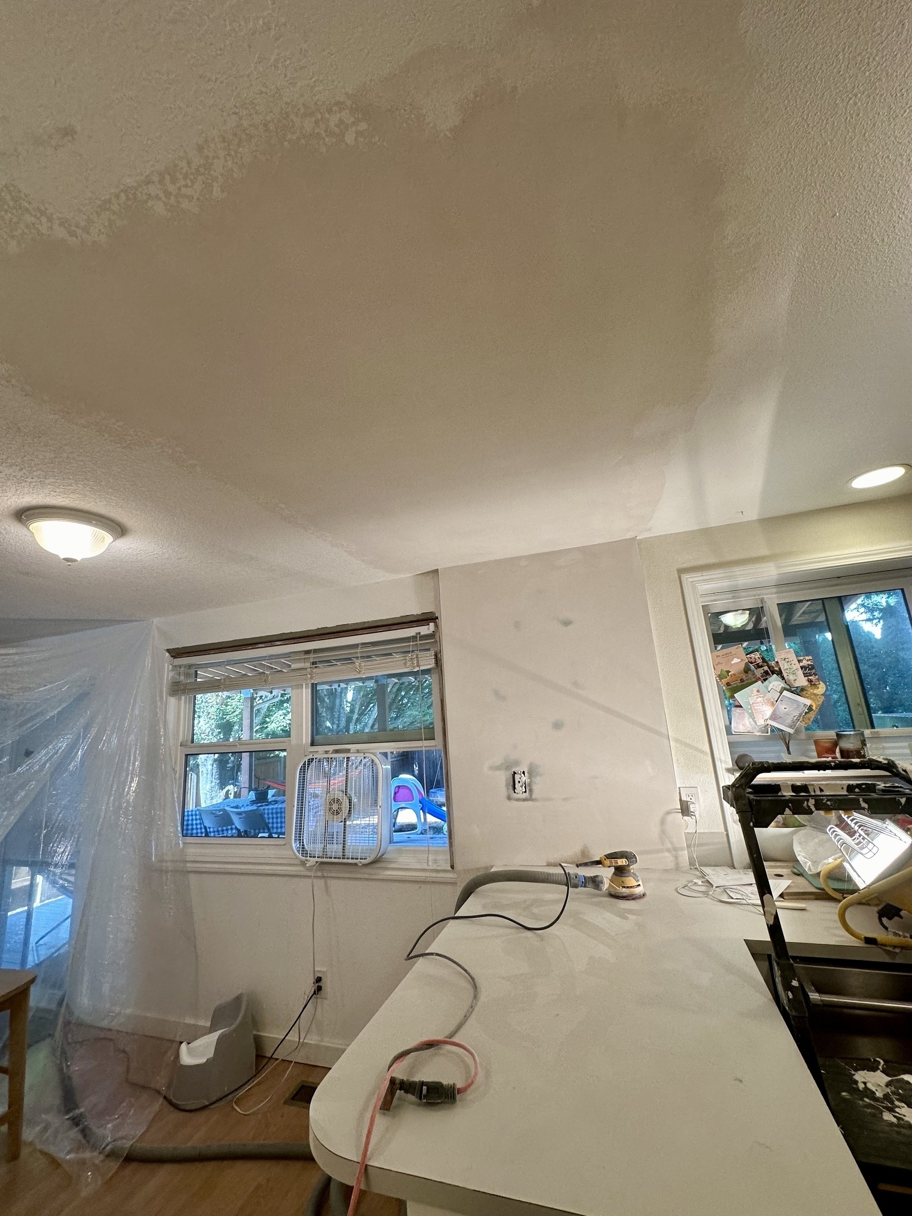 Tore out a cabinet soffit from the ceiling and ripped out the side wall to replace some leaky plumbing. Now trying to finish the drywall sometime before the kids graduate. Note to self: hire somebody next time.